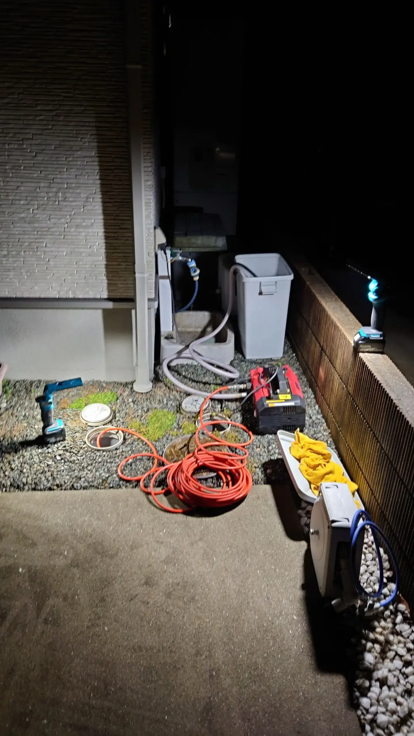 まず屋外の汚水桝を開口し、高圧洗浄機を使用して配管内部の汚れを除去しました。