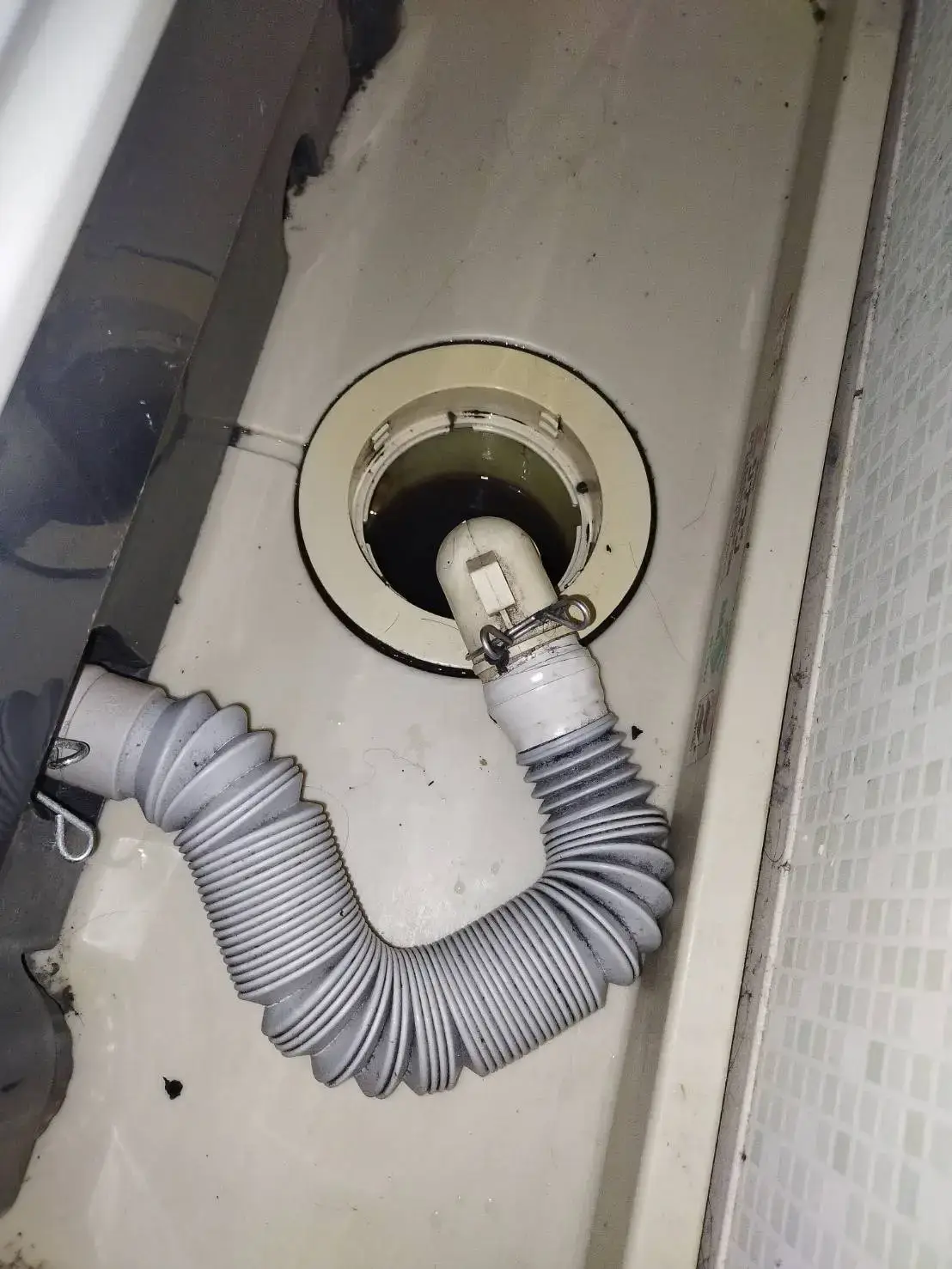 洗濯機排水口のつまりにより床面へ水が広がる症状が確認されました。