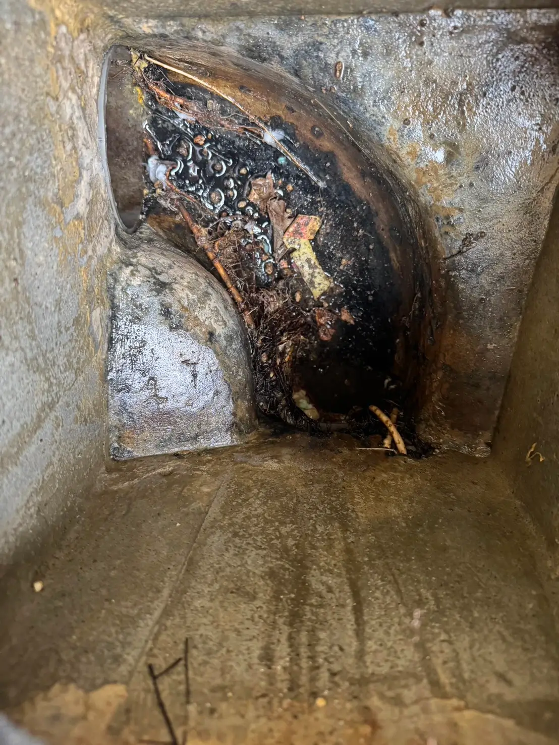 根が絡みつくことで汚物が堆積し、水の流れを妨げている状態でした。