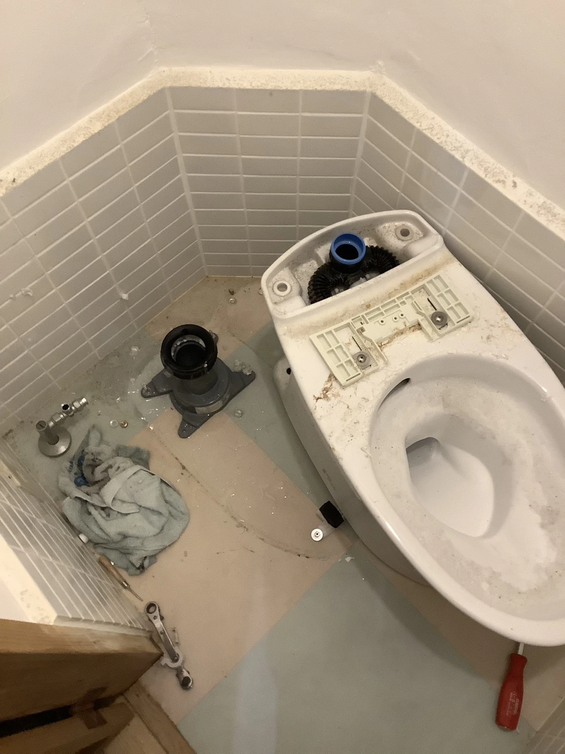 便器を脱着し、内部に詰まっていたプラスチック製の異物を取り除いております。